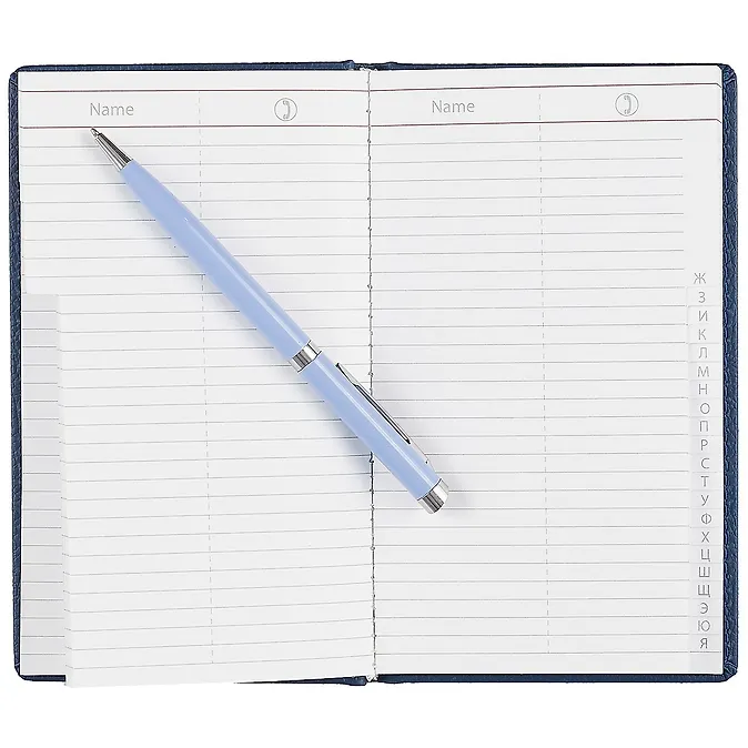 Записная книжка телефонная в мягкой обложке (картон+поролон+кожзам) из кожзаменителя синего цвета с петлей для крепления ручки, скругленными углами и слепым тиснением надписи, формат А5 (205х145х20 мм.), 216 стр., алфавитная вырубка. Раздел для записи телефонов отпечатан на белой бумаге. Дополнительный раздел для заметок в клетку отпечатан на тонированной бумаге.