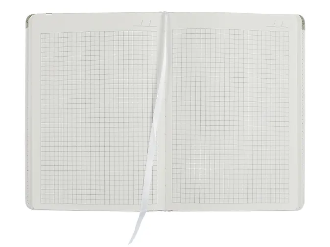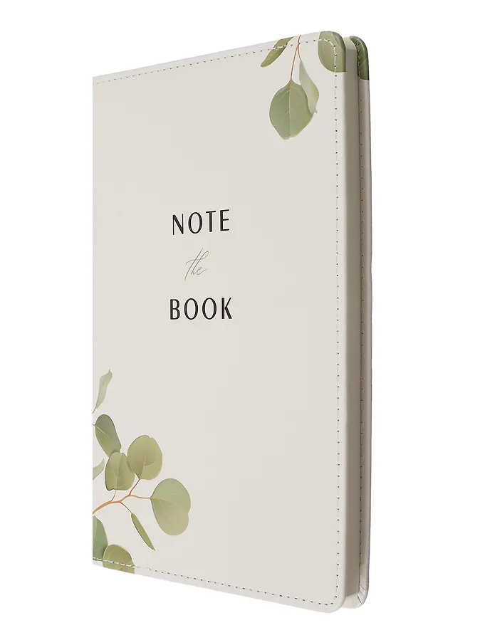 Обложка выполнена из плотного полимерного материала с бархатистым покрытием. Цвет — белый. В центре напечатан лаконичный принт: изящная зелёная веточка и надпись Notebook**. По краю есть прошивка нитками в тон. Благодаря закруглённым углам обложка дольше сохраняет аккуратный вид. А закладка-ляссе обеспечивает быструю навигацию.