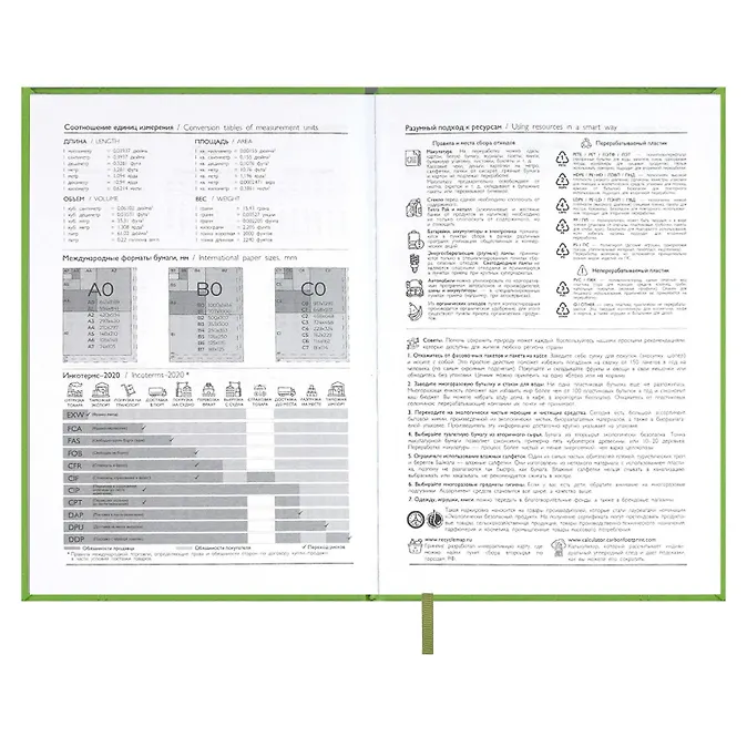 (кожзам: 146х211 мм, твёрдый переплёт с поролоном, материал обложки: искусственная кожа «Наппа»; декор: блинтовое тиснение, отделочная строчка; способ крепления блока: ниткошвейный; вн. блок: 176 л., белый офсет 70 г/м², печать в одну краску (линия), справочный материал: есть; перфорация углов блока: нет; закладка/-и: одно ляссе; каптал: есть; форзац: без печати; персонализация возможна: да; индивидуальная упаковка: промостикер + ПЭТ-пакет)