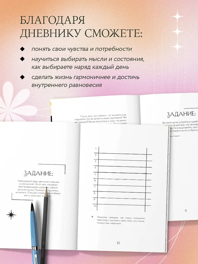 Этот блокнот — для всех, кто хочет улучшить свою жизнь, отношения с собой и окружающими. Он научит вас следить за своим состоянием, понимать свои эмоции и желания. Поможет сделать жизнь более сбалансированной и радостной. Вам станет легче держать фокус на важном и не упускать ценные моменты.