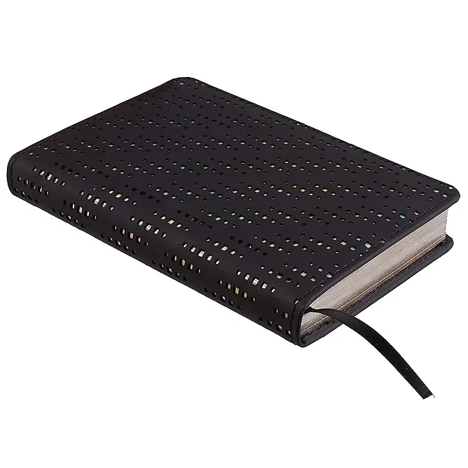 Ежедневник недатированный арт.47591/15 СОФТ-ТАЧ ИССИНЯ-ЧЁРНЫЙ (А6, 148х103, 320 стр., декоративная перфорация и голографическая подложка, обстрочка обложки по периметру нитками в цвет переплётного материала, серебряный фольгированный срез, твёрдый переплёт с поролоном, тонированный офсет, 70, перфорация, голографическая подложка, одна краска, дизайн блока:линия ,печать форзаца: одна краска, ниткошвейный, закладка: одно ляссе, каптал: есть, спр. мат: есть, ПЭТ-пакет)