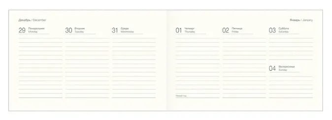 Горизонтальный планер содержит 64 листа (128 страниц) хорошей плотности 70 г/м2 цвета слоновой кости, что делает их комфортными для записей. Cтраницы цвета слоновой кости в линейку и неделя на одном развороте помогут структурировать задачи и планы на день.