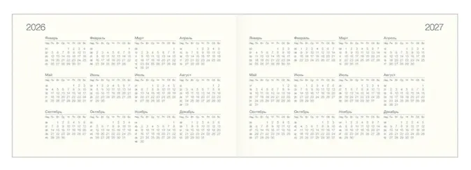 Также внутри блока: титульный лист для записи данных, разворот с календарями на 2026-2027 года, раздел «планирование и важные данные», чтобы перед глазами были сразу все самые важные задачи каждого месяца, и страницы для дополнительных заметок.
