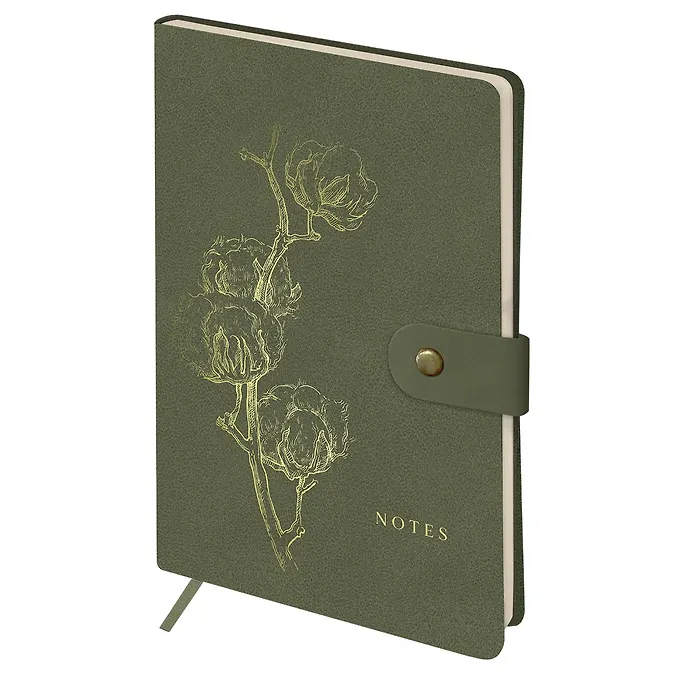 Обложка из экокожи дополнена фольгированным тиснением. В изделии используется интегральный (лайт) переплёт. Обложка записной книжки лёгкая, но при этом прочная и надёжная.