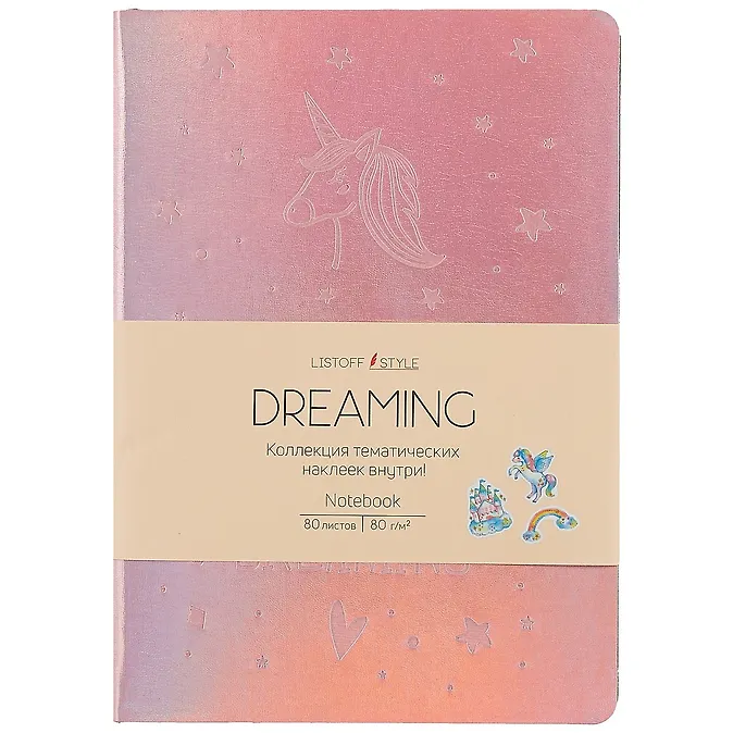 Серия записных книжек «DREAMING» с эксклюзивными стильными тематическими наклейками: «единороги и фантазии». В каждой записной книжке — 48 наклеек в кармашке. Выпускаются в формате B6.