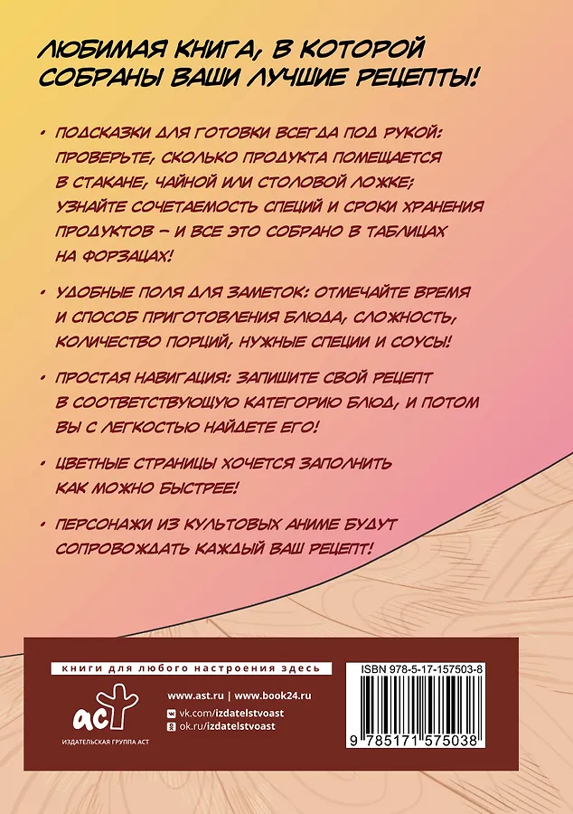 ○ Подсказки для готовки всегда под рукой: проверьте, сколько продукта помещается в стакане, чайной или столовой ложке; узнайте сочетаемость специй и сроки хранения продуктов – и все это собрано в таблицах на форзацах!