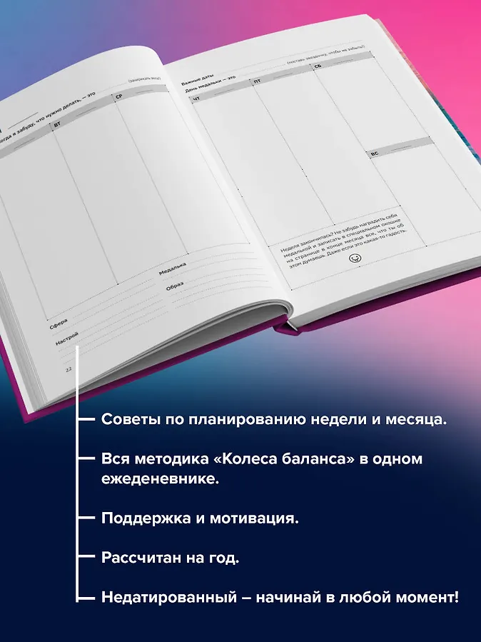 Эта эффективная методика легла в основу уникального ежедневника. Все необходимое собрано вместе — не надо искать и придумывать. Начать можно прямо сейчас — не нужно ждать понедельника!