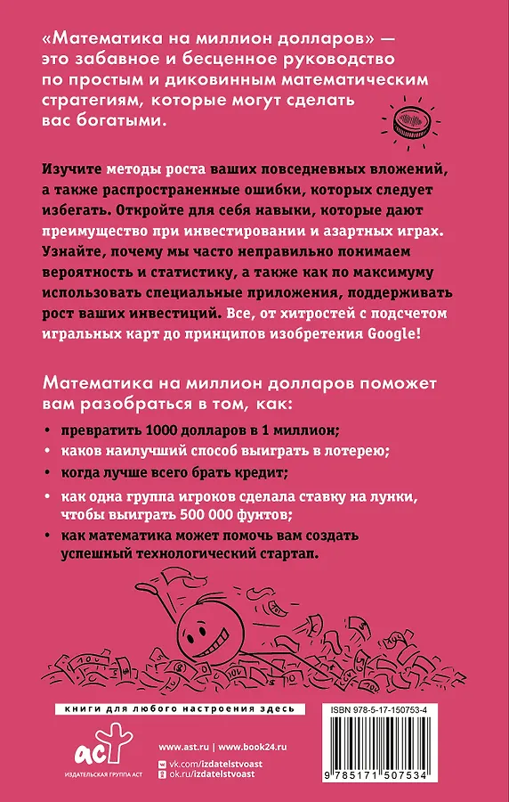«Математика на миллион долларов» — это забавное и бесценное руководство по простым и диковинным математическим стратегиям, которые могут сделать вас богатыми. Изучите методы роста ваших повседневных вложений, а также распространенные ошибки, которых следует избегать. Откройте для себя навыки, которые дают дополнительное преимущество при инвестировании и азартных играх. Узнайте, почему мы часто неправильно понимаем вероятность и статистику, а также как по максимуму использовать специальные приложения, поддерживать рост ваших инвестиций. Все, от хитростей с подсчетом игральных карт до принципов изобретения Google!