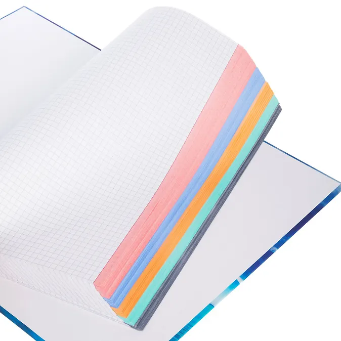 Тетрадь А4 формата 120 листов. Обложка: твердая, ламинированная. Внутренний блок: офсет 60 гр., клетка, многоцветный срез, многоуровневая перфорация. Скрепление: гребень. Тетрадь предназначена для записей, используется студентами и в офисе. Внутренний блок имеет универсальную перфорацию для подшивки листов в папку, перфорация на отрыв имеет засечку для более удобного использования. Скрепление ‘гребень’ дает возможность раскрывать тетрадь на 360 градусов, а твердая обложка позволяет делать записи на весу. Многоцветный срез помогает разделять записи по тематическим рубрикам.
