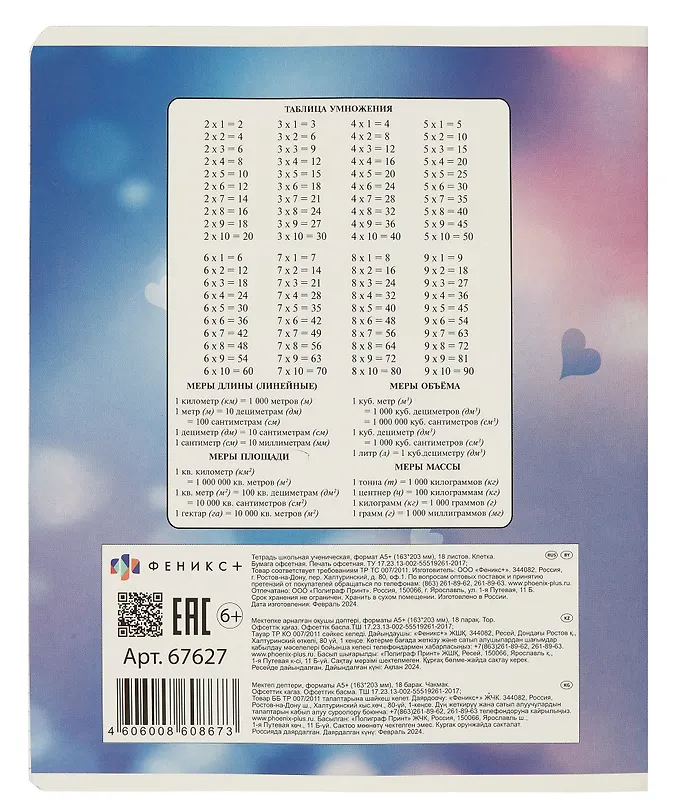 Тетрадь подойдет для занятий любому школьнику, используется для письма шариковыми, гелевыми и капиллярными ручками, а скругленные уголки тетради помогут надолго сохранить её привлекательный внешний вид. Тетрадь школьная ученическая. Формат А5+. Количество листов — 18 л. Тип обложки — мягкий переплёт (2 скобы). Материал обложки — мелованный картон 190 г/м². Кругление углов: есть. Печать обложки: полноцветная печать. Отделка обложки: выборочный УФ-лак. Цвет внутреннего блока — белый офсет. Плотность бумаги: 60 г/м². Красочность блока: печать в две краски. Дизайн блока: клетка.