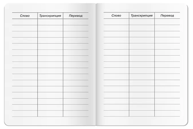 Тетрадь учебного формата (158 х 210 мм) адресована самым младшим школьникам и всем, кто только начинает изучать английский язык. Каждая страница для записи слов разделена на три колонки — слово на английском языке, транскрипция и перевод. Так со временем, заполняя тетрадь, ученики составляют тетрадь-словарь.