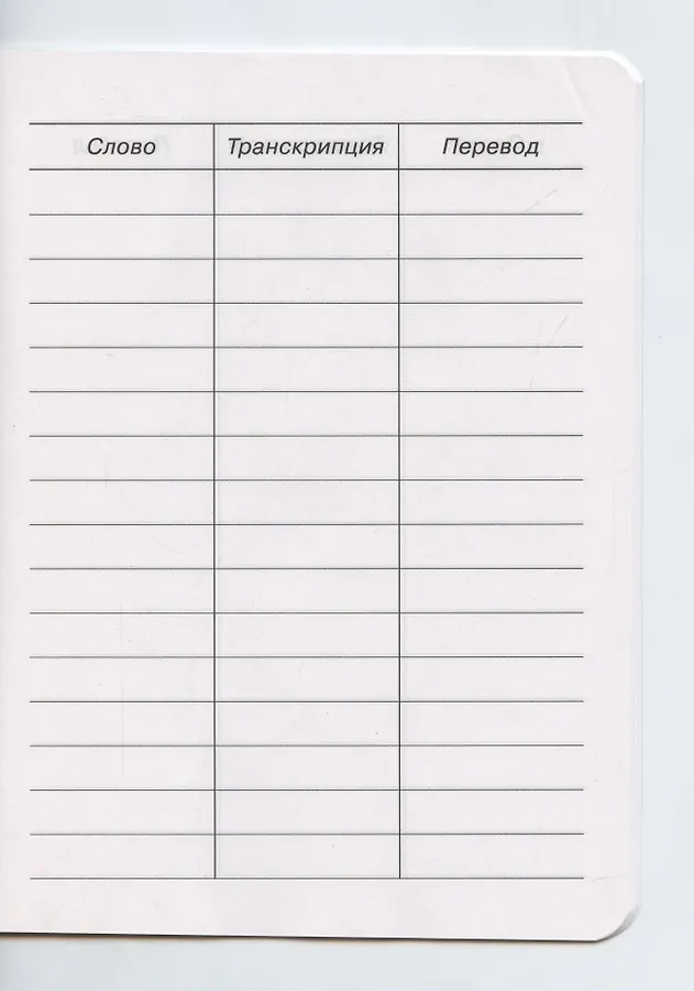 Каждая страница для записи слов разделена на три колонки — слово, транскрипция и перевод. Для удобства записи страницы разлинованы, а расстояние между строчками больше обычного в полтора раза. Так со временем, заполняя тетрадь, ученики составляют тетрадь-словарь.