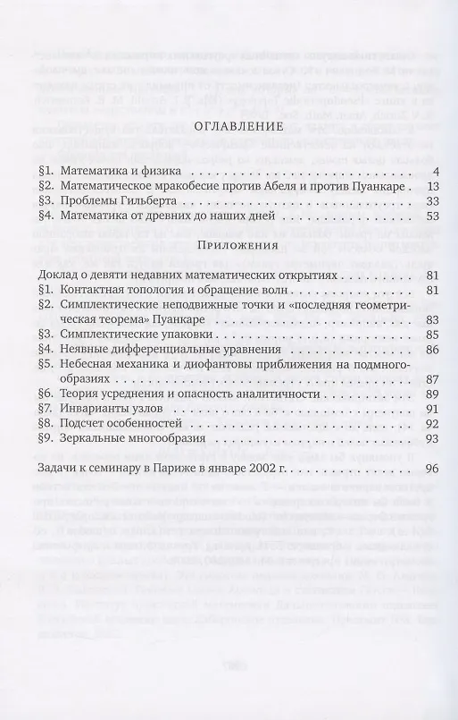 Основным содержанием книги является статья академика Владимира Игоревича Арнольда, написанная в 2002 году: …Я буду говорить в основном о содержательных примерах, показывающих кардинальные различия точек зрения аксиомофилов и естествоиспытателей уже на столь фундаментальные понятия, как производные и пределы, теоремы существования и единственности, оптимизация и теория управления, как неразрешимость одних проблем и измерение сложности других… Книга содержит также Доклад о девяти недавних математических открытиях и Задачи парижского семинара 2002 года. Предыдущее издание вышло в 2012 г.