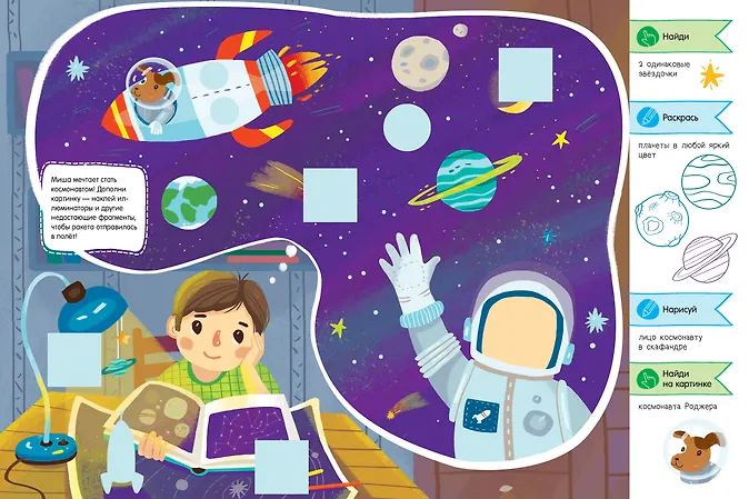 «Книжка с наклейками для мальчиков. 50 наклеек» — настоящее сокровище для озорного мальчишки! Это 15 панорамных разворотов с его самыми любимыми темами, среди которых динозавры, машинки, футбол, транспорт, пираты, походы… Даже разглядывать их будет интересно, не говоря о том, что ему предстоит поиграть в любимую игру малышей «найди и покажи», сосчитать нужные предметы, дорисовать картинки, ответить на сложные вопросы и, конечно, воспользоваться 50 яркими наклейками!