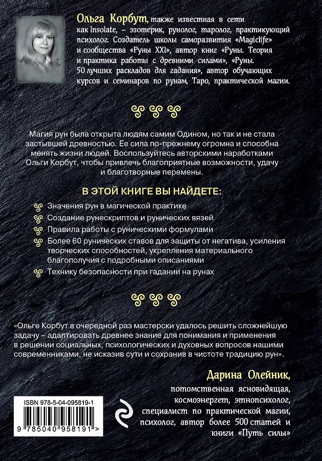 Книга опытного рунолога Ольги Корбут, известной в сети под ником Insolate, посвящена рунической магии – практике, уходящей корнями в глубь веков, но остающейся актуальной и для нас с вами. Руны настолько могущественны, что работают даже в руках несведущих людей – и именно поэтому требует глубокого и тщательного изучения, осторожного и уважительного подхода. Из этой книги вы узнаете, как правильно составлять ставы и использовать готовые, как и куда их наносить, активировать и читать. И конечно – каких ошибок избегать при взаимодействии с могущественной силой рун и в магической практике.