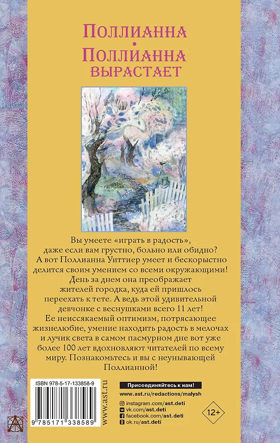 Американская писательница Элинор Портер (1868–1920) известна по всему миру как «мама Поллианны». Она создала образ милой девчушки с «оживленным веснушчатым личиком» и двумя толстыми косами за спиной. Но отнюдь не приятная внешность повсеместно прославила Поллианну, а ее удивительная способность во всем видеть хорошее. Природный оптимизм помогает Поллианне переживать тяжелые времена — ее мать и отец умерли, и девочка вынуждена переехать к своей чопорной, скупой на ласку тете. Однако чудесным образом сердце Поллианны не черствеет, а напротив, распахивается навстречу миру, озаряя все вокруг теплом, светом и неиссякаемой жизненной энергией.