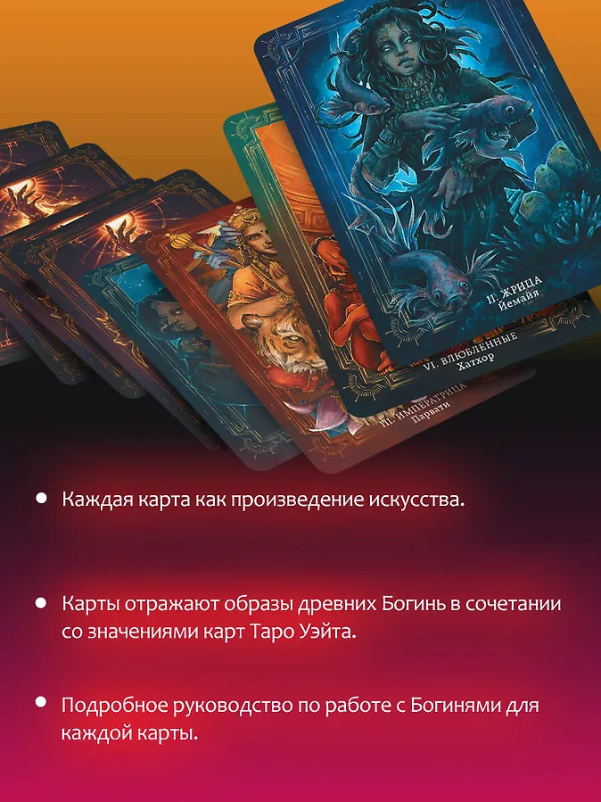 Каждая станет твоим проводником и ответит на любой вопрос. В процессе гадания могут выпадать самые разные карты, и, беря колоду в руки, ты должна быть готова встретить многообразие энергий. Есть тут богини, олицетворяющие ярость, зависть, жадность, а есть и те, которые несут нежность, гармонию и свет. Главное правило при работе с этой колодой — относиться ко всем богиням с равным уважением.